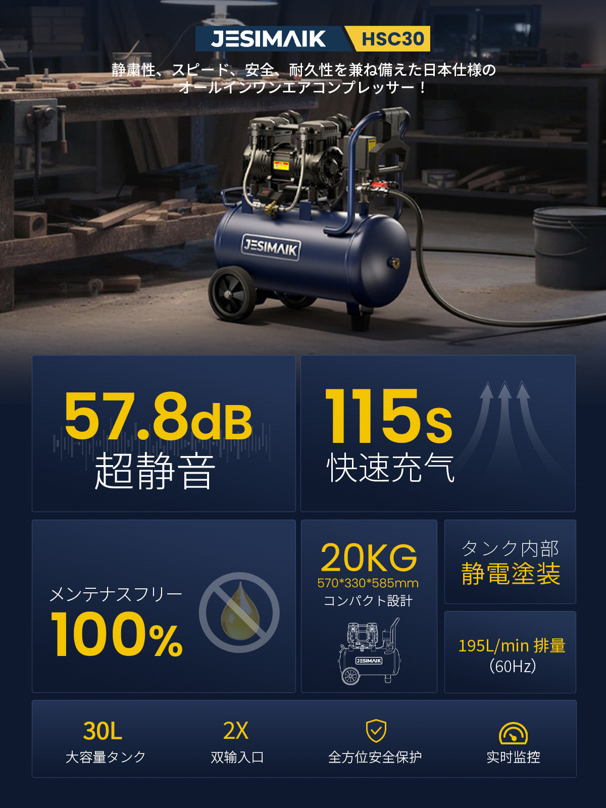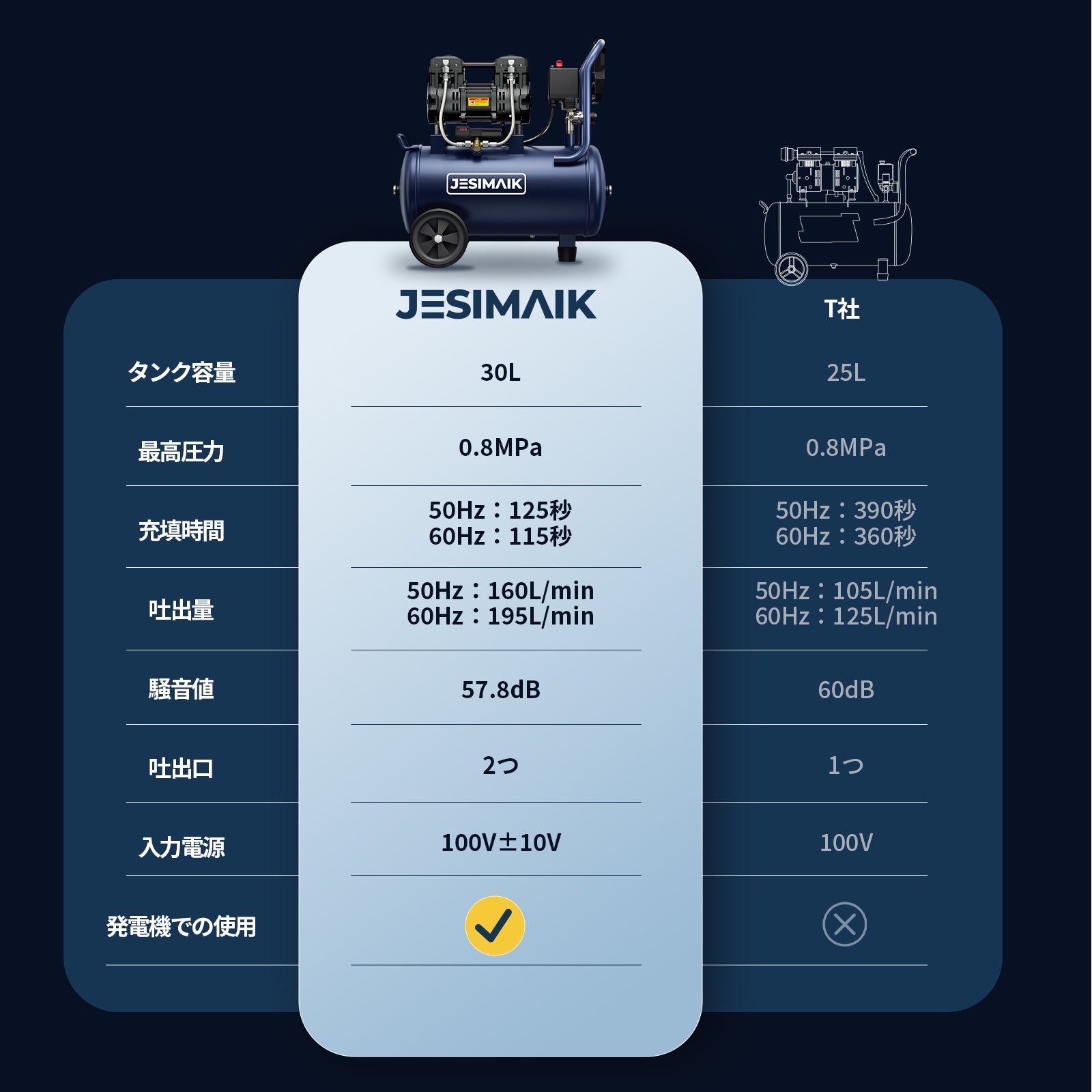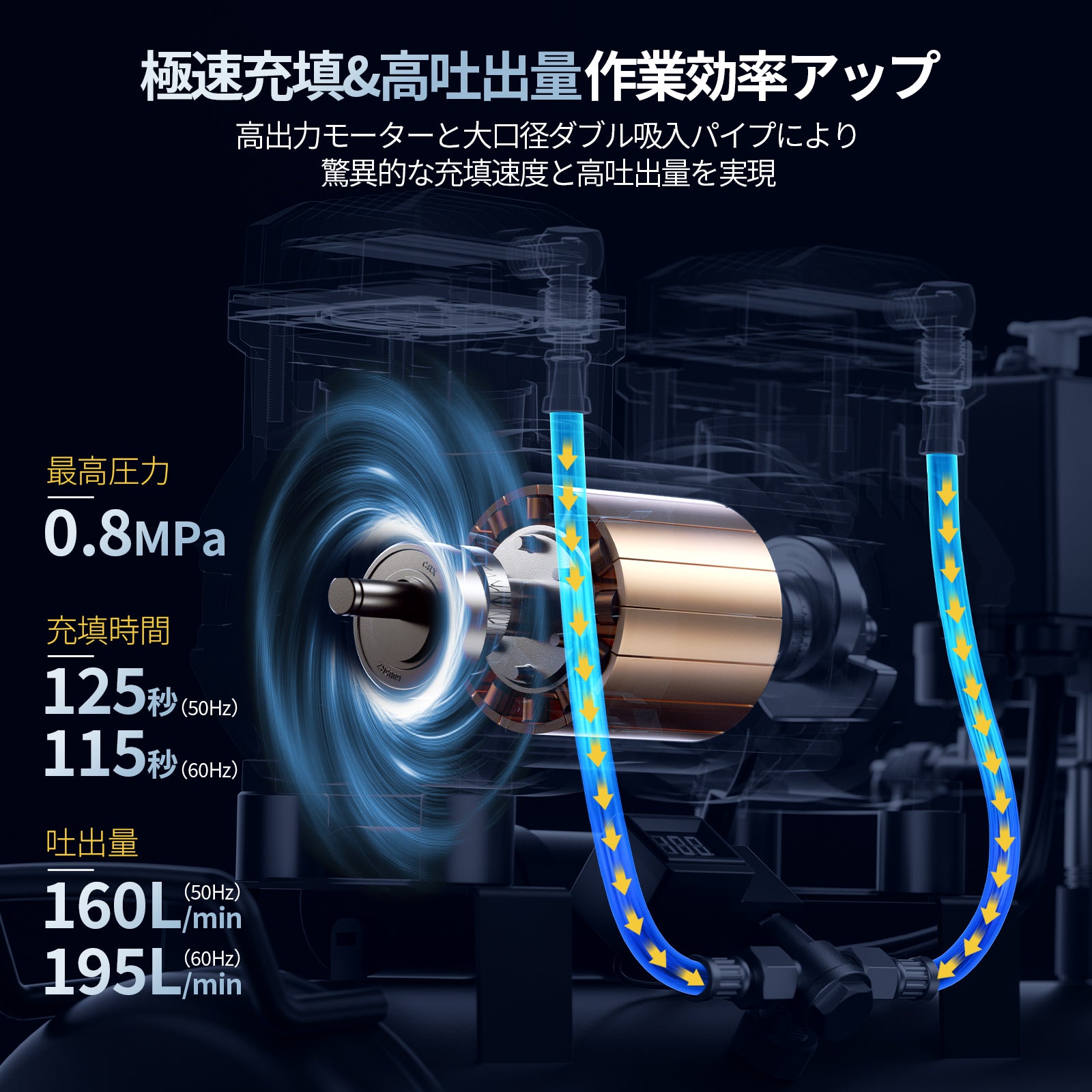 - 【高速エアー充填&2つの吐出口】最高圧力:0.8MPa 充填時間:125秒(50Hz)、115秒( 60Hz)吐出量:160L/min(50Hz)、195L/min(60Hz)。高出力モーターと大口径ダブル吸入パイプを採用することで、驚異的な充填速度と高吐出量を実現します。さらに2つの吐出口(ワンタッチソケット1/4)を備え、同時に2工具を駆動可能、カプラーワンタッチ接続で工具の変更も便利!JESIMAIK エアコンプレッサー HSC30を使って、作業効率を飛躍的に向上!