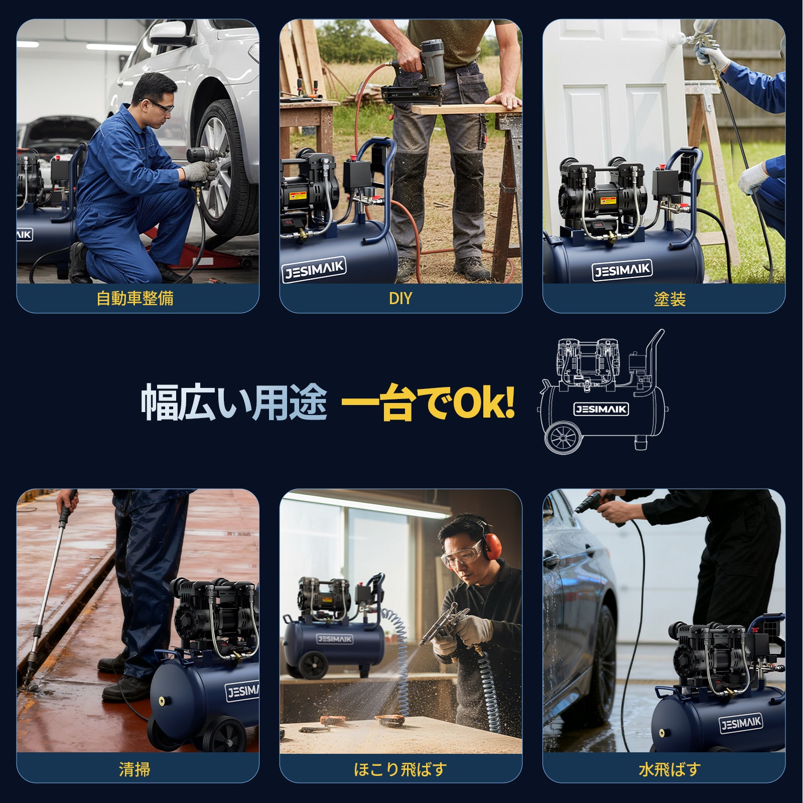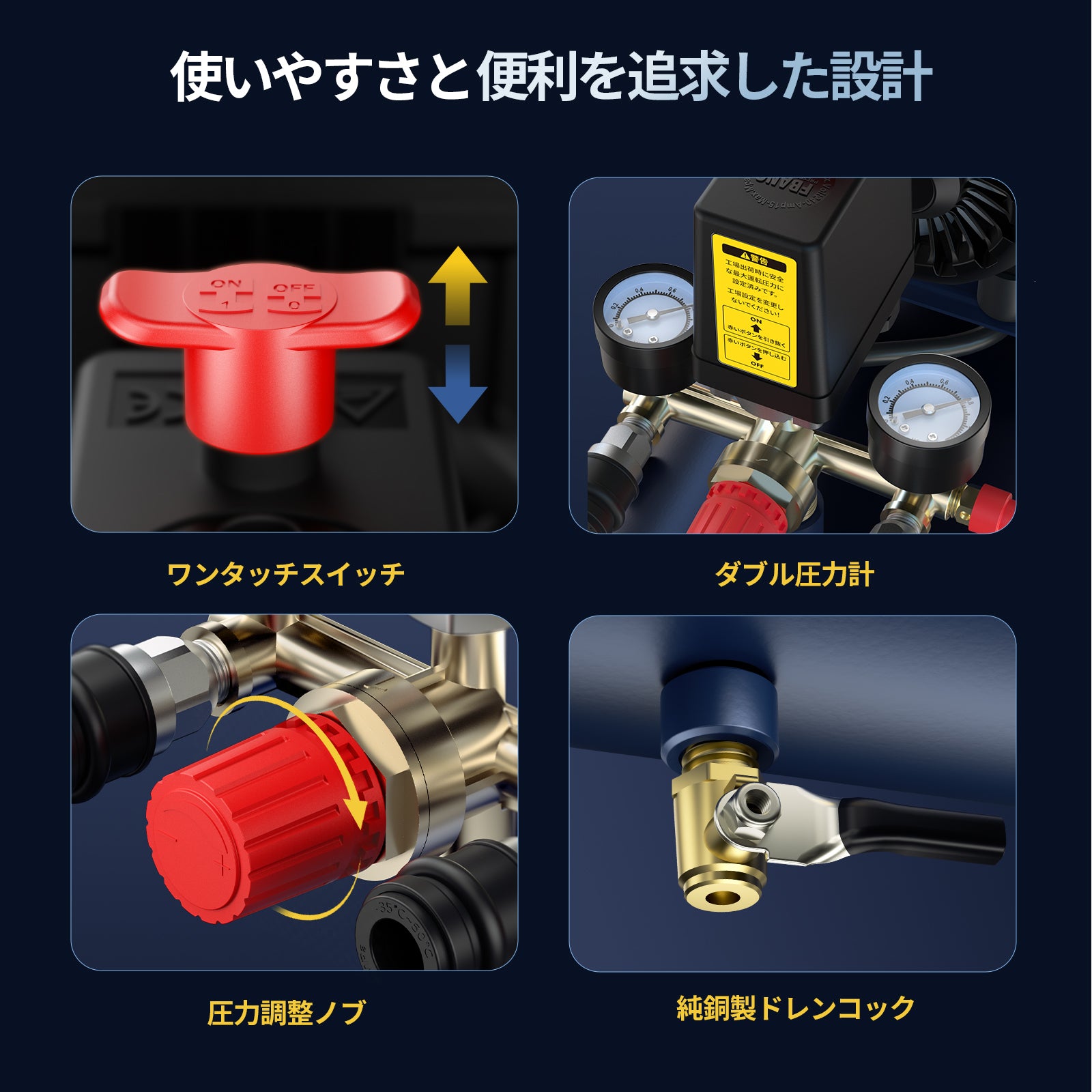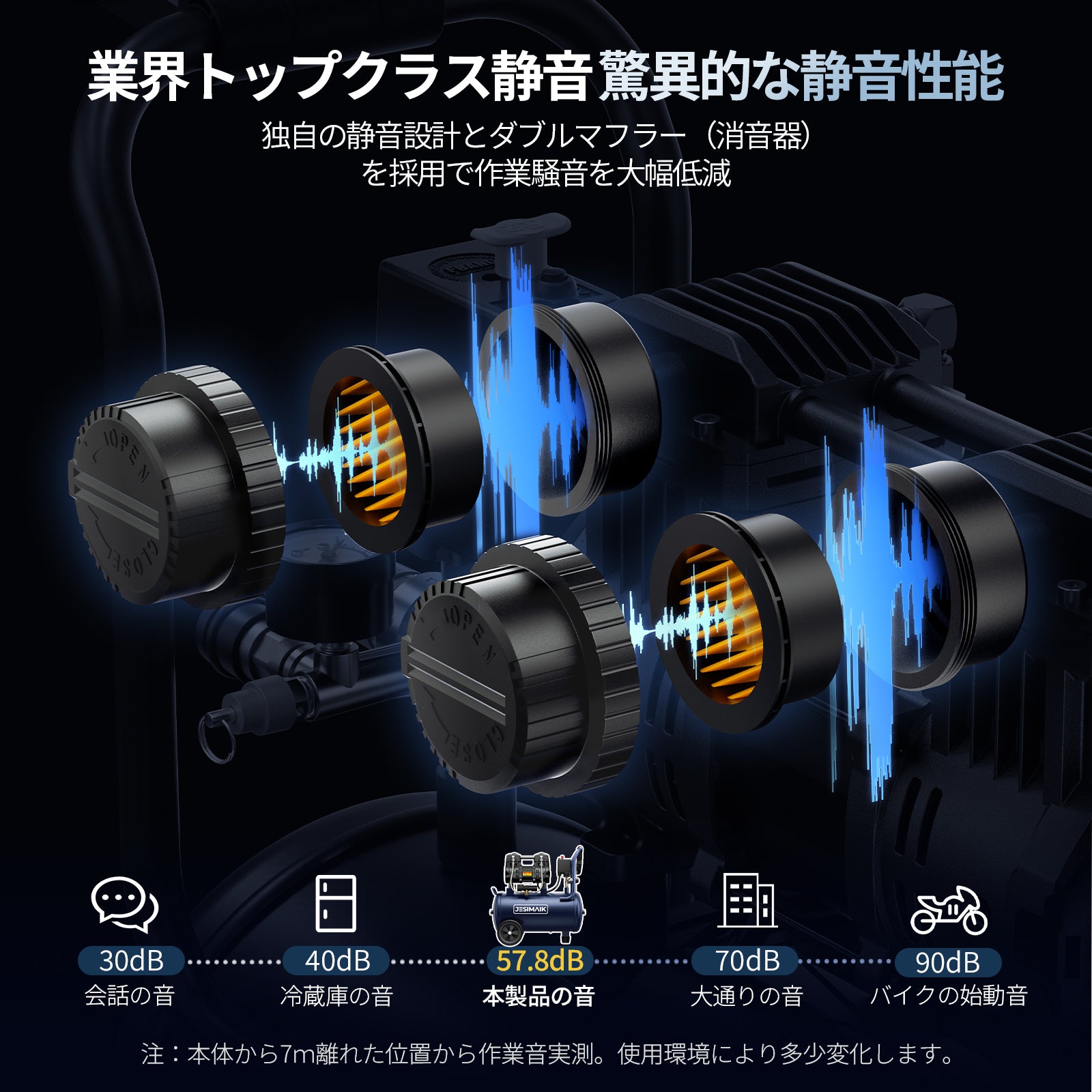 - 【静音設計&30L大容量タンク】本エアコンプレッサーは、独自の静音構造とダブルマフラー(二重消音器)を採用で運転音を57.8dBまで抑えることにします。(57.8dBは本体から7m離れた位置から作業音実測定です。使用環境温度によって多少違いがあります。)30L大容量タンクにより、エア工具の駆動はもちろん、空気入れ、細部の清掃、塗装、DIY、自動車整備など、様々なシーンで活躍しています。