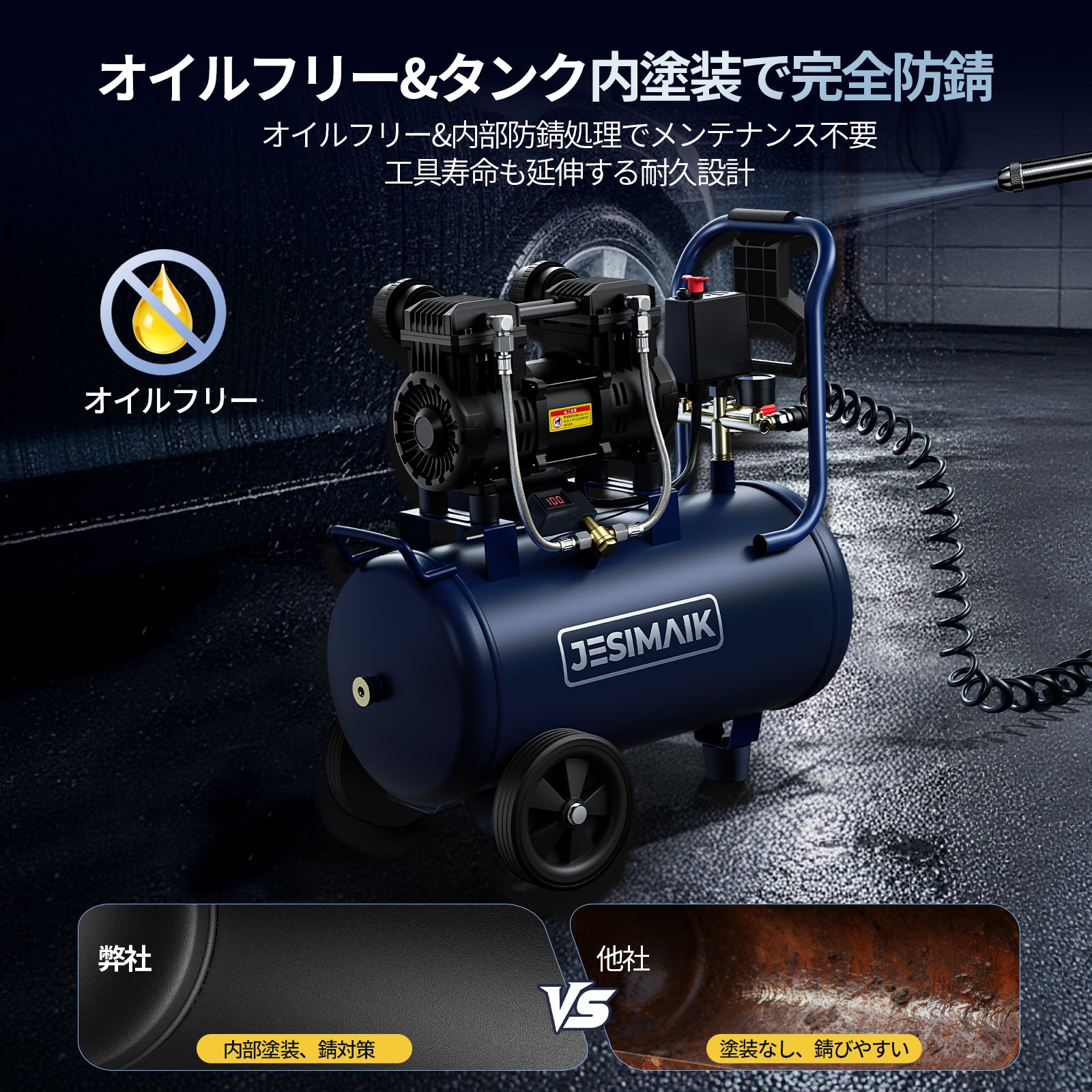 - 【オイルフリー&完全防錆対応】このエアコンプレッサーはオイル交換の必要なし、メンテナンスも不要。タンク内部は完全防錆噴塗 を施し、錆発生を根本的に防止します。錆汁の飛散やオイル混入によるエアーツールの損傷を防ぎ、工具と本体の両方の寿命を大幅に延伸します。メンテナンスフリーで、常にクリーンな空気を吐出し、吹き飛ばし作業に最適!