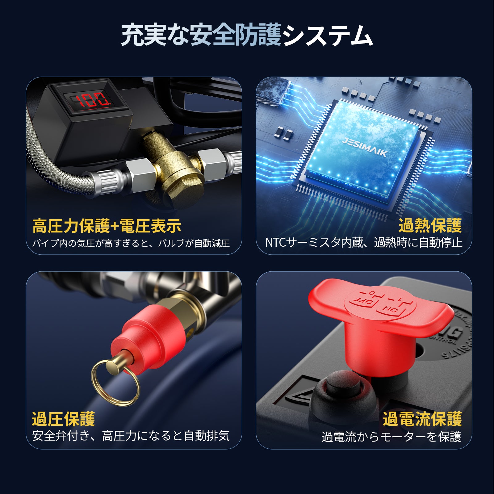 - 【安全防護システム&長寿命設計】過電流保護、高圧保護、過熱保護、過圧保護など安全システムを搭載、エアコンプレッサー安全運転を確保しております。ステンレス編み網製ホース、純銅製バルブ、二重エアフィルターなど、重要な部品には高耐久素材を採用、モーターの外装にアルミ筐体覆われ、冷却ファンによる強力な放熱構造で、耐久性と長寿命を実現します。