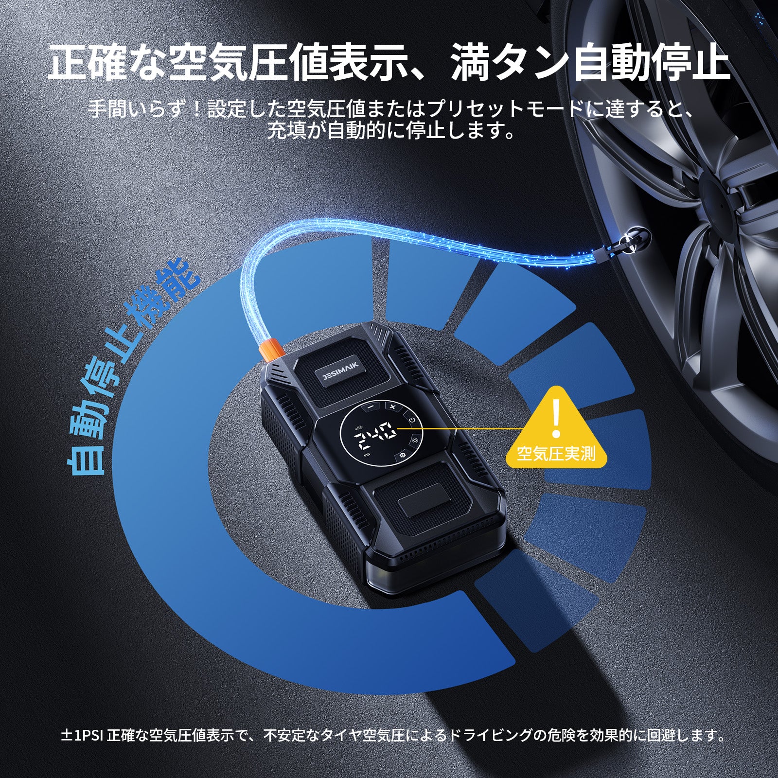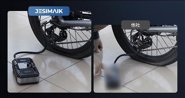 - 【AIアルゴリズム 騒音低減&寿命延長】独自開発のAIアルゴリズムにより、始動時の大きな電流衝撃を軽減し、バッテリーとモーターの寿命を延ばすとともに、空気入れの動作音と振動も低減し、ノイズを最適化します。さらに、目標の空気圧に達すると自動停止する機能を備えているため、過充気によるタイヤ損傷のリスクを軽減し、空気入れ本体の劣化も避けることができます。