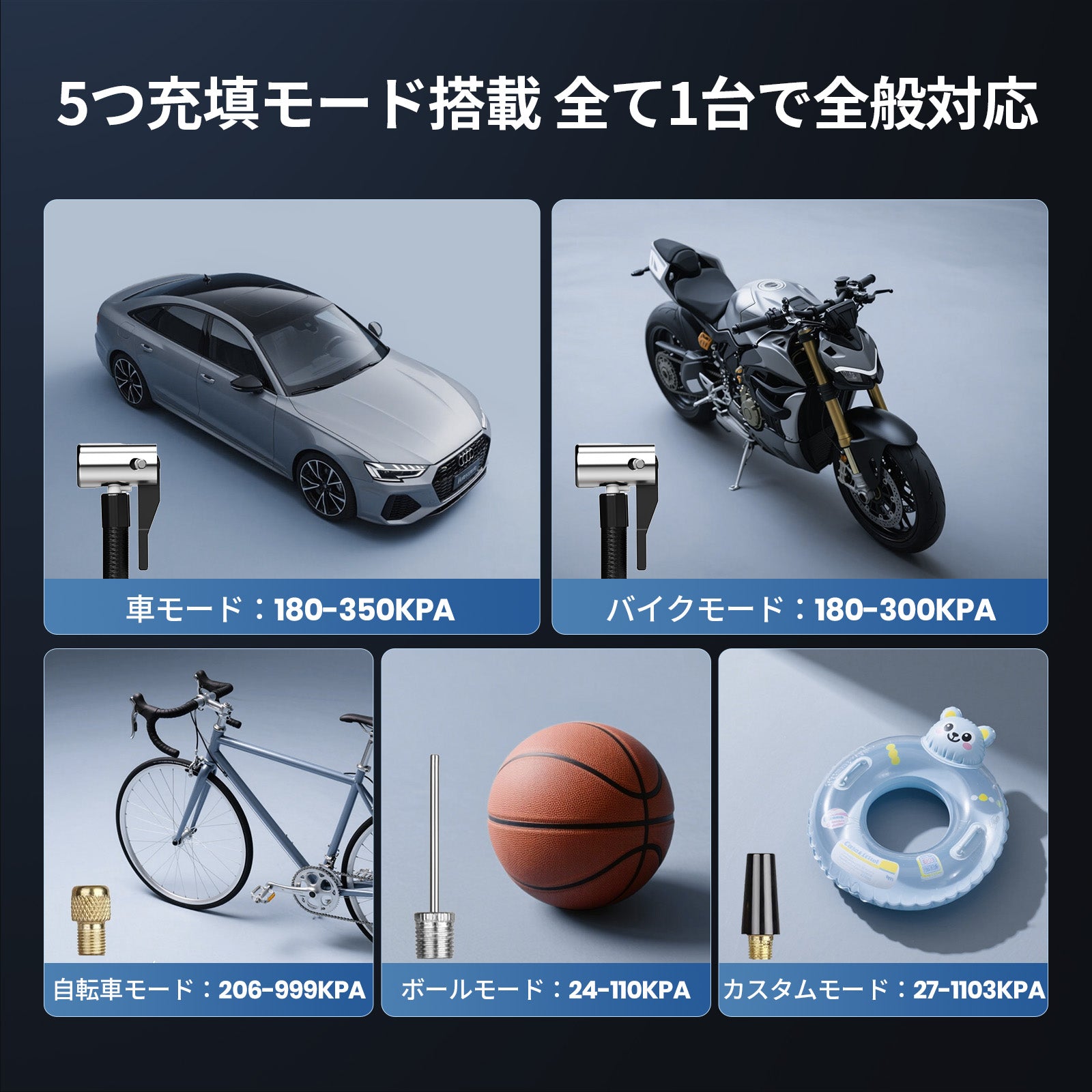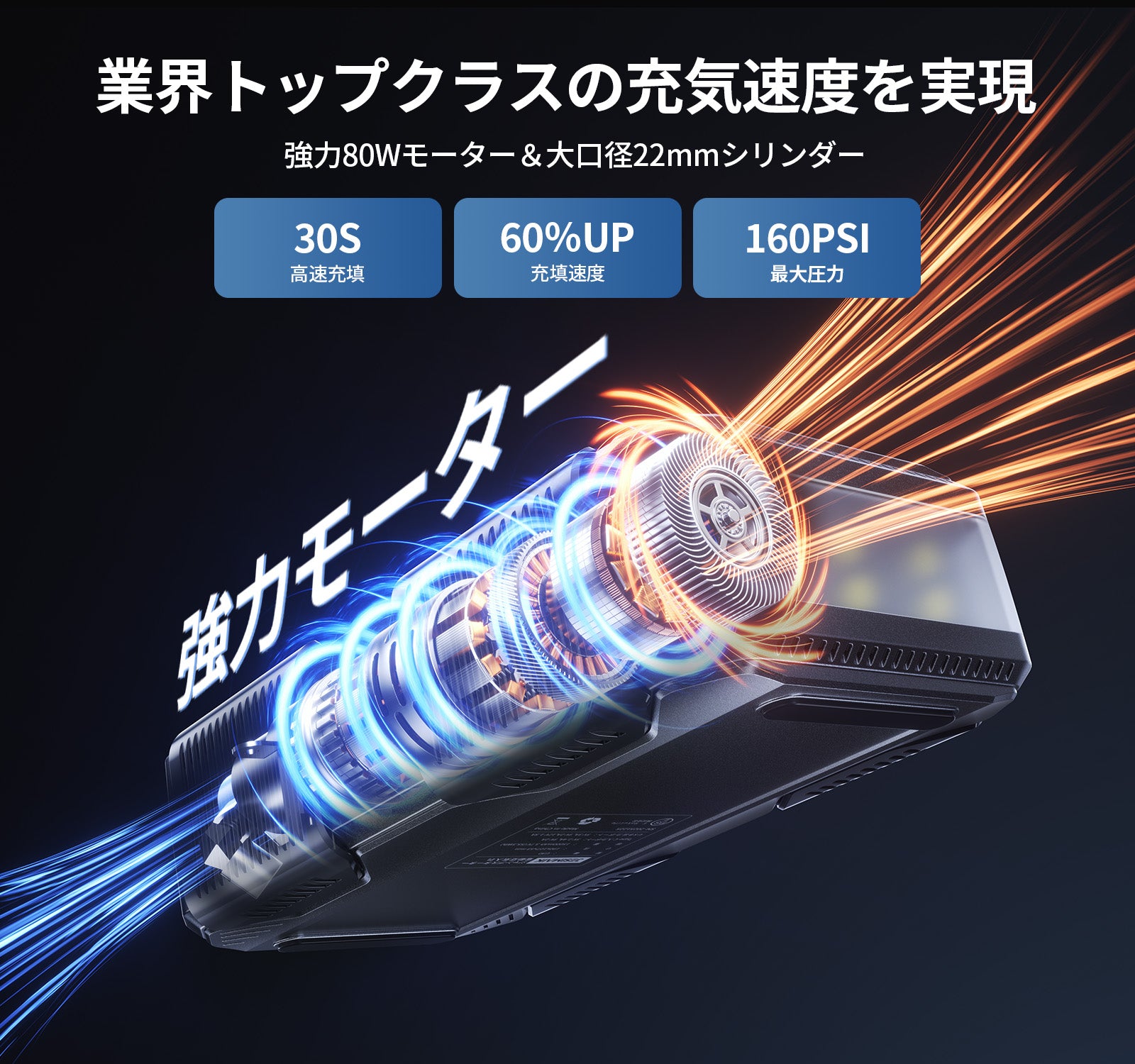 - 【30S超高速充填 最大160PSI】電動空気入れは22mm大型シリンダーとを採用し、僅か30秒でタイヤを満充填できます。80Wの強力モーターで40L/minの高速充填スピードを実現し、充填効率60%アップ!最大圧力160PSI(1103kpa)までに達し、どんなタイプのタイヤでも余裕で対応可能です。圧倒的な充填速度とパワフルな圧力で緊急時でもタイヤをすぐに満たせ、焦らない安心できます。