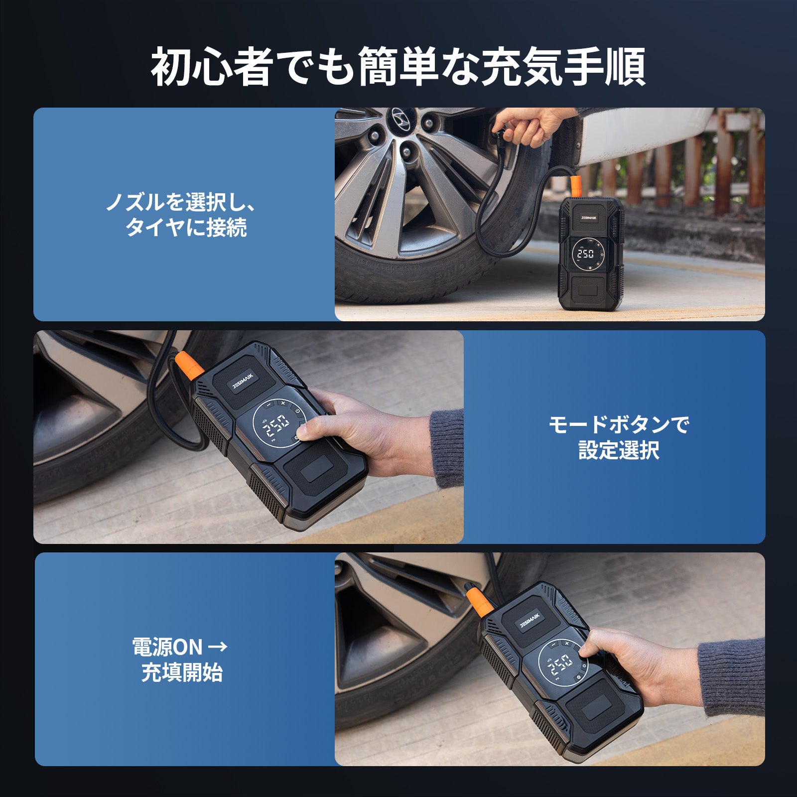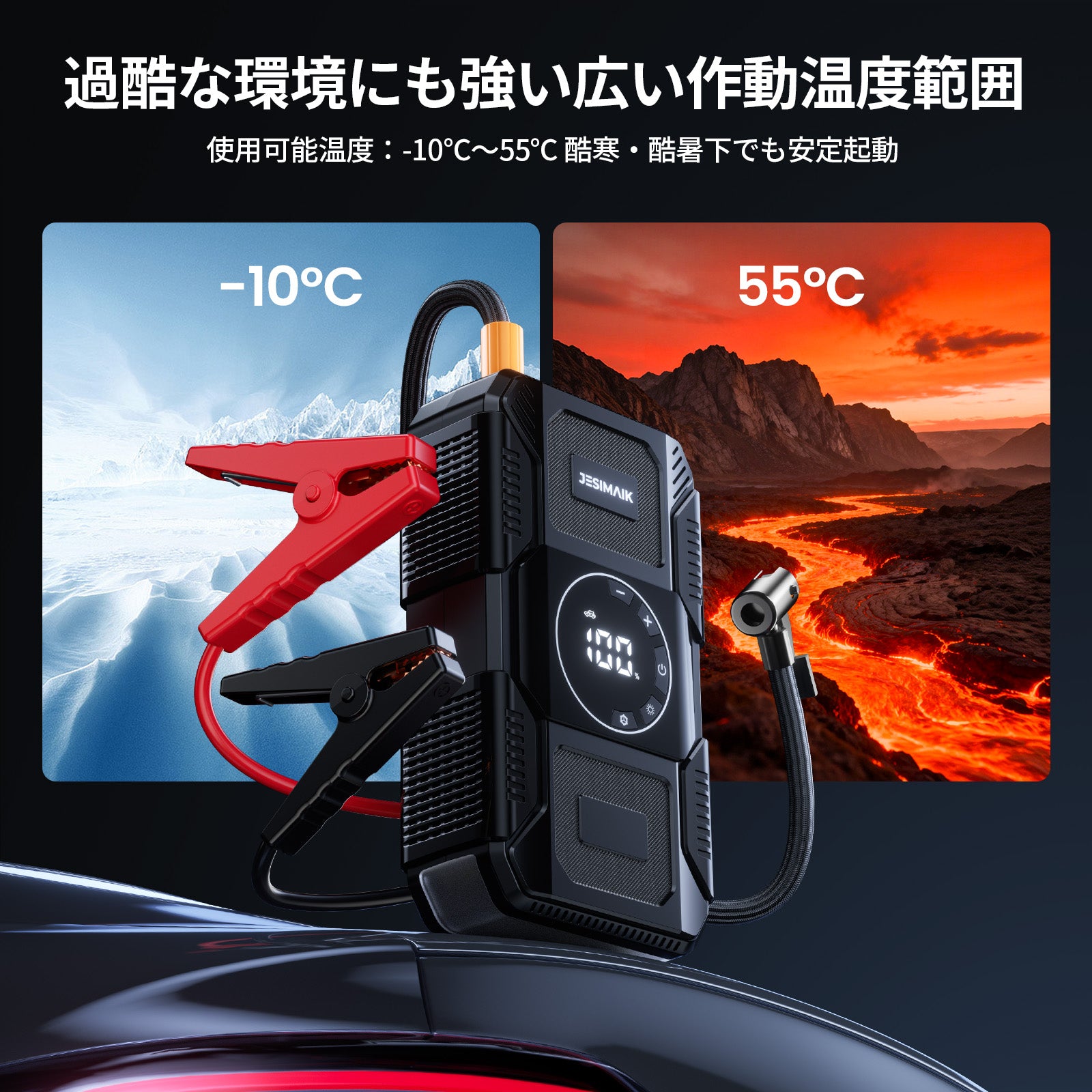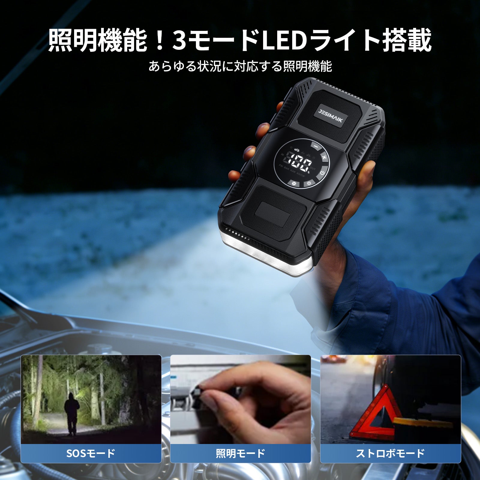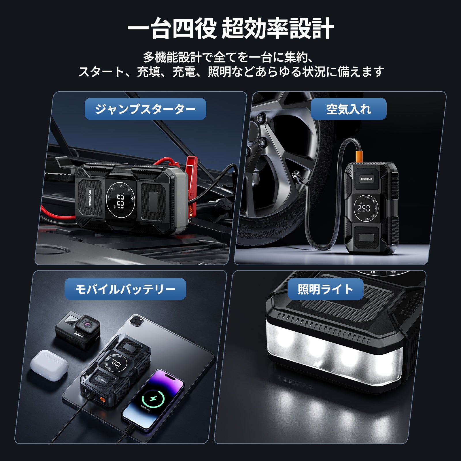 - 【4in1多機能 あらゆる緊急事態に備え】JESIMAIK U30はジャンプスターター、電動空気入れ、18Wモバイルバッテリー、高亮度LEDライトの4大機能を一台に搭載!車のバッテリー上がりはもちろん、タイヤの空気圧調整、スマホの緊急充電、夜間作業時の照明など、ドライブシーンからアウトドアまで幅広く対応します。従来は別々に用意する必要があったアイテムをこれ一台で、車内のスペースを大幅に節約し、いざという時に素早く対処できる安心感を提供します。様々な緊急状況や日常の不便を解消し、まさに車載用の万能助手となります。
