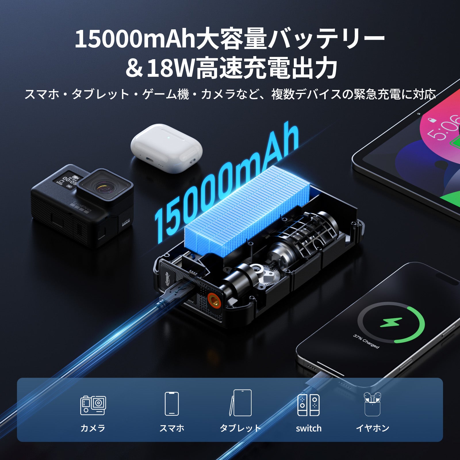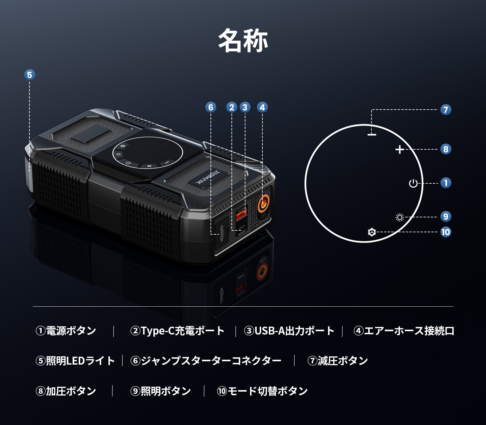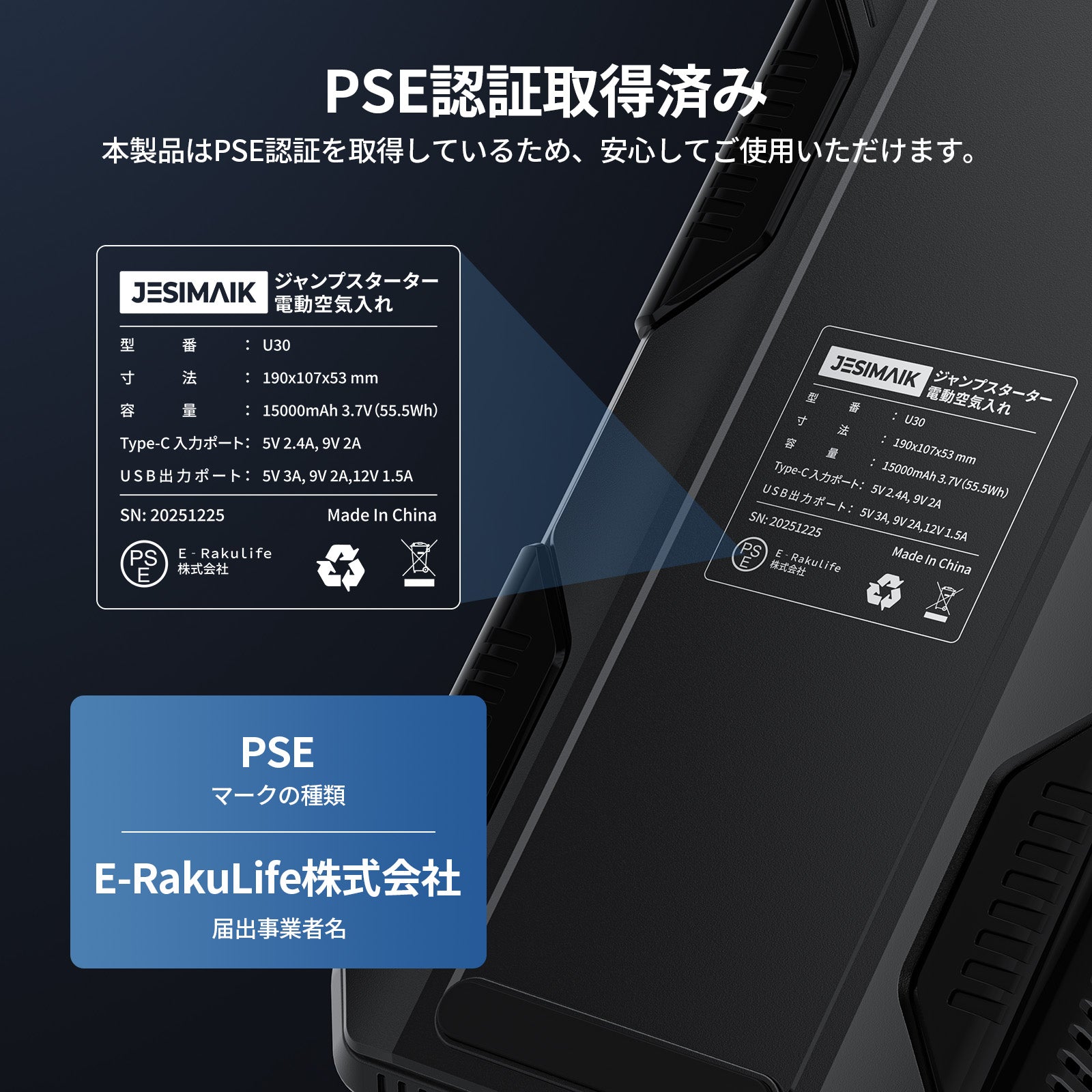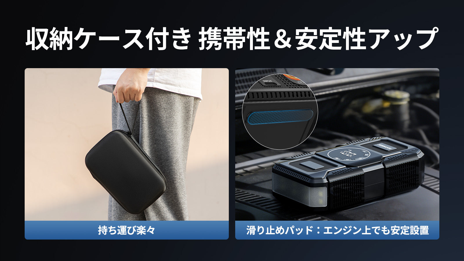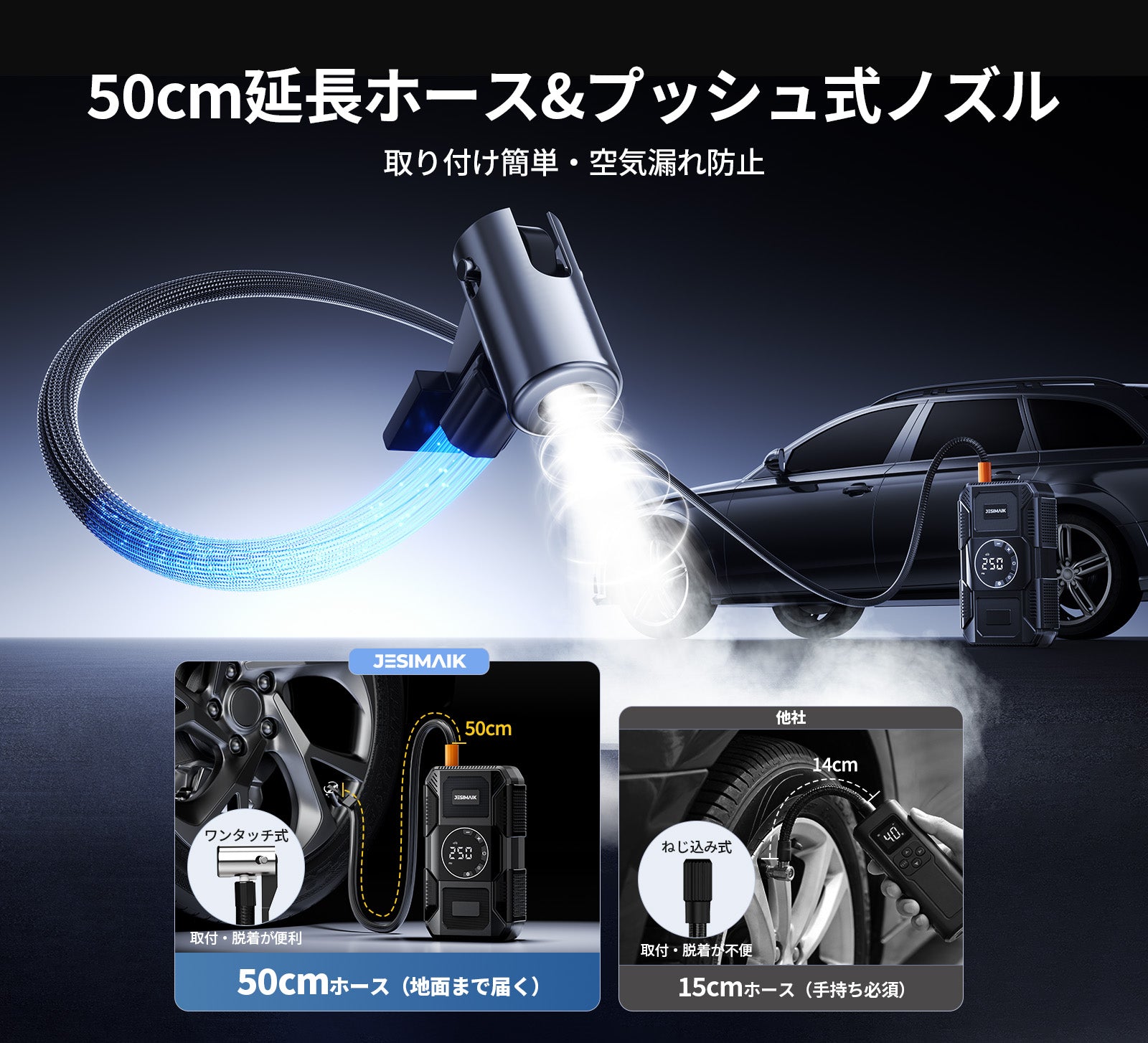 - 【4in1多機能 あらゆる緊急事態に備え】JESIMAIK U30はジャンプスターター、電動空気入れ、18Wモバイルバッテリー、高亮度LEDライトの4大機能を一台に搭載!車のバッテリー上がりはもちろん、タイヤの空気圧調整、スマホの緊急充電、夜間作業時の照明など、ドライブシーンからアウトドアまで幅広く対応します。従来は別々に用意する必要があったアイテムをこれ一台で、車内のスペースを大幅に節約し、いざという時に素早く対処できる安心感を提供します。様々な緊急状況や日常の不便を解消し、まさに車載用の万能助手となります。