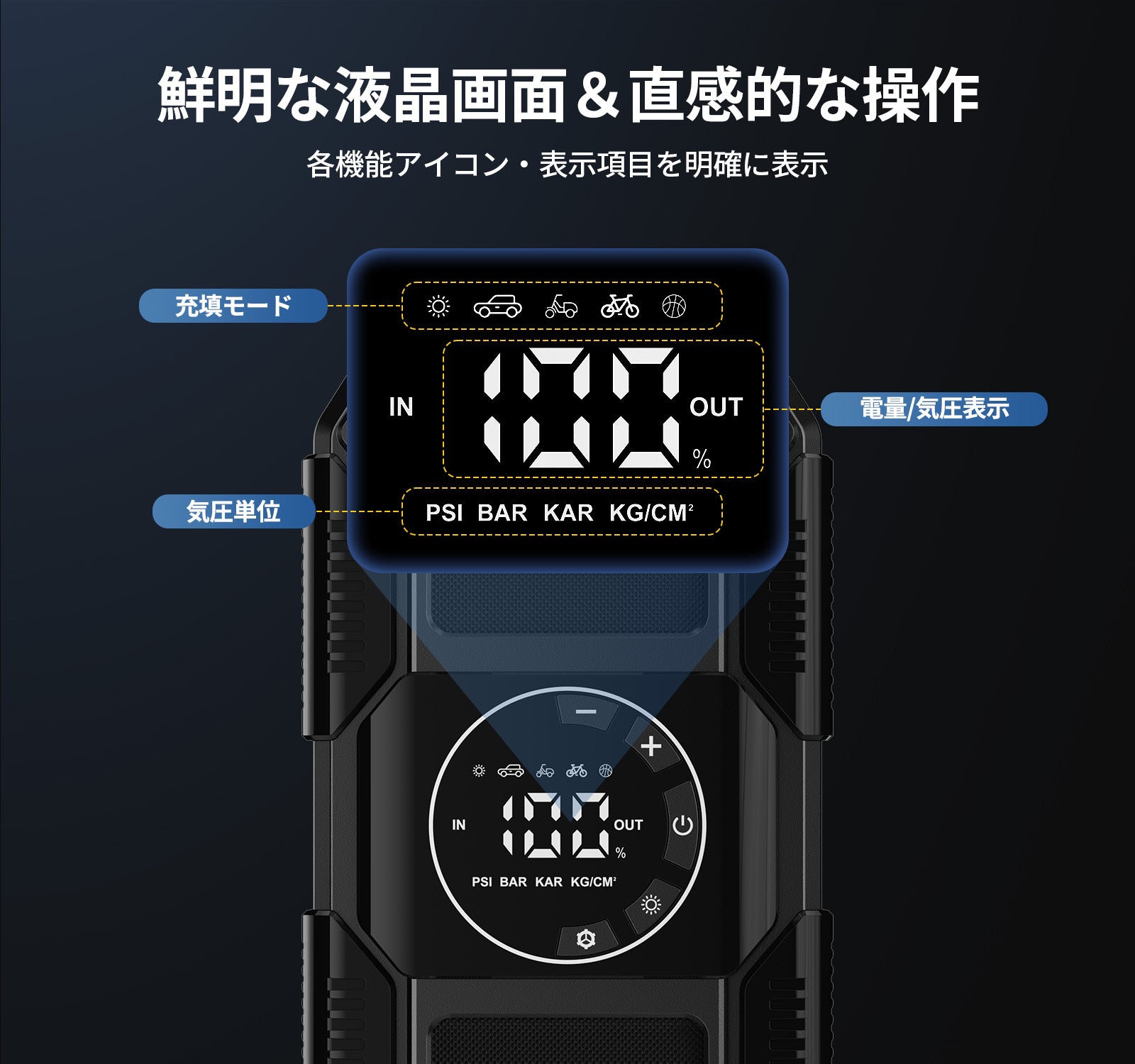 - 【大容量バッテリー&大画面表示】15000mAhの大容量リチウム電池を搭載しており、繰り返しのエンジン始動や長時間の充気作業にも十分な電力を供給します。さらに、USB出力ポートでは18Wの高速充電をサポートし、緊急時にスマホの電池切れ心配する必要がありません。現在の空気圧やバッテリー残量状態が1%単位で確認できる高精度な液晶ディスプレイで、残量を常に正確に把握できます。