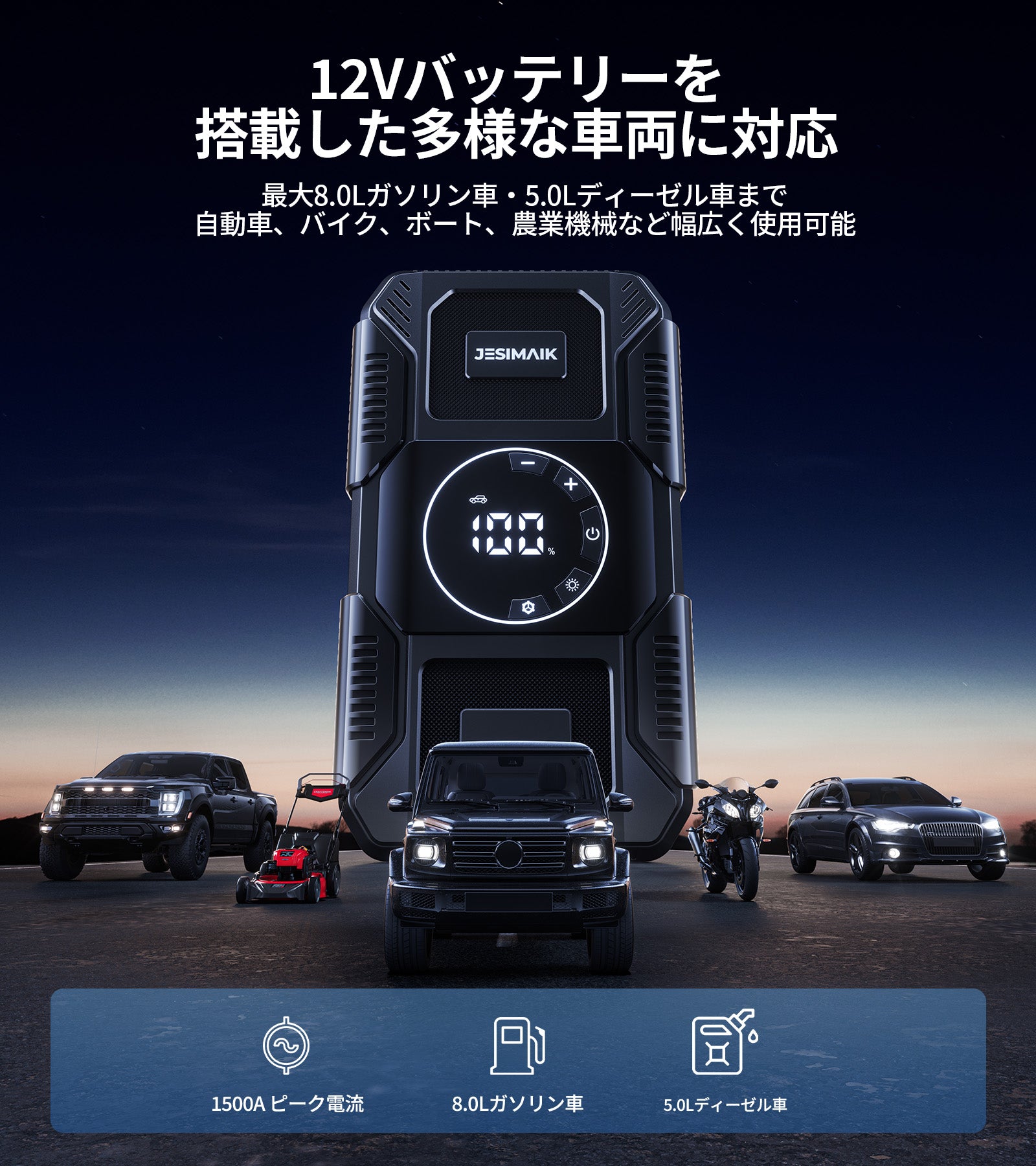 - 【強力1500A始動 スマート電圧認識】ジャンプスターターは1500Aのピーク電流を実現し、最大8.0Lのガソリン車や5.0Lのディーゼルの車両を確実に始動可能です。自動車だけでなく、12Vのバイク、ボート、芝刈り機などの農業機械も対応可能です。独自のインテリジェントシステム技術を搭載しており、バッテリーの内部電圧を自動認識。0Vになったな完全なバッテリー上がりでも、面倒な強制起動ボタンを押す必要がなく、そのまま簡単に始動できます。