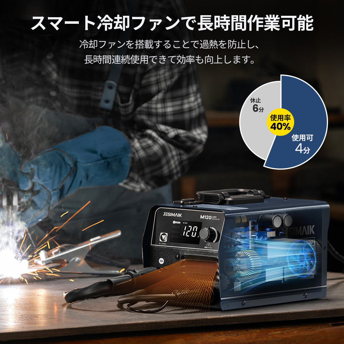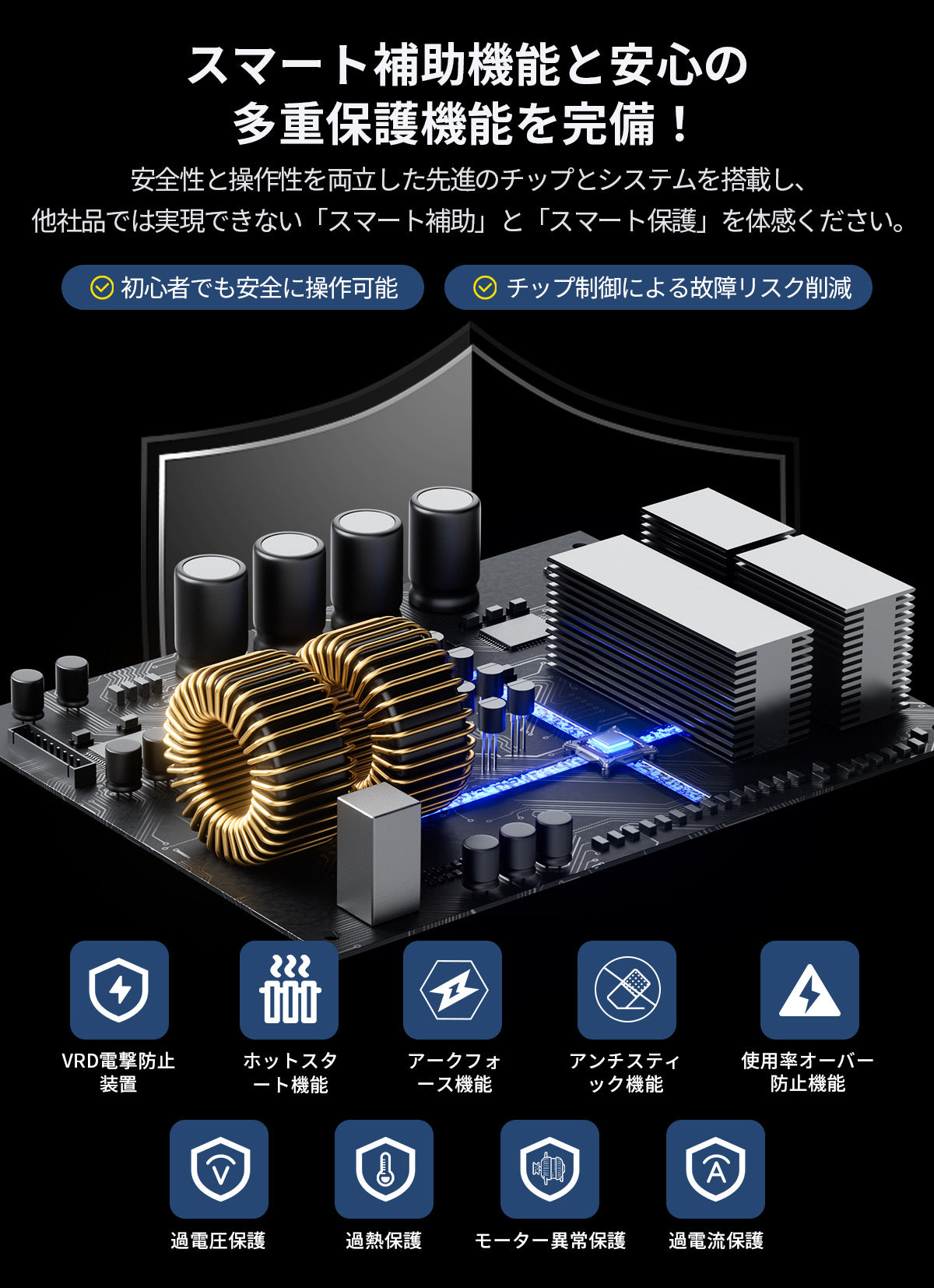 VRD電撃防止に加え、過熱・過電流・過負荷保護と冷却ファンを搭載。連続作業時の温度上昇を抑え、安定稼働を実現。