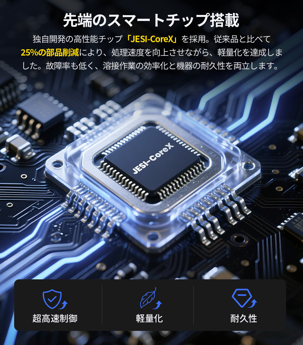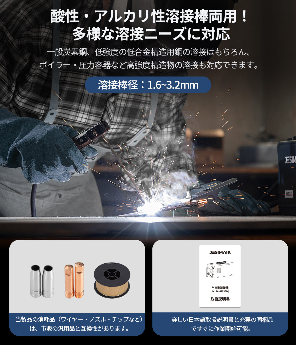 ホットスタート/アークフォース/アンチスティックを搭載。初期着弧の不安や電極の貼り付き、薄板低電流時のアーク切れを抑え、初心者でも扱いやすい。