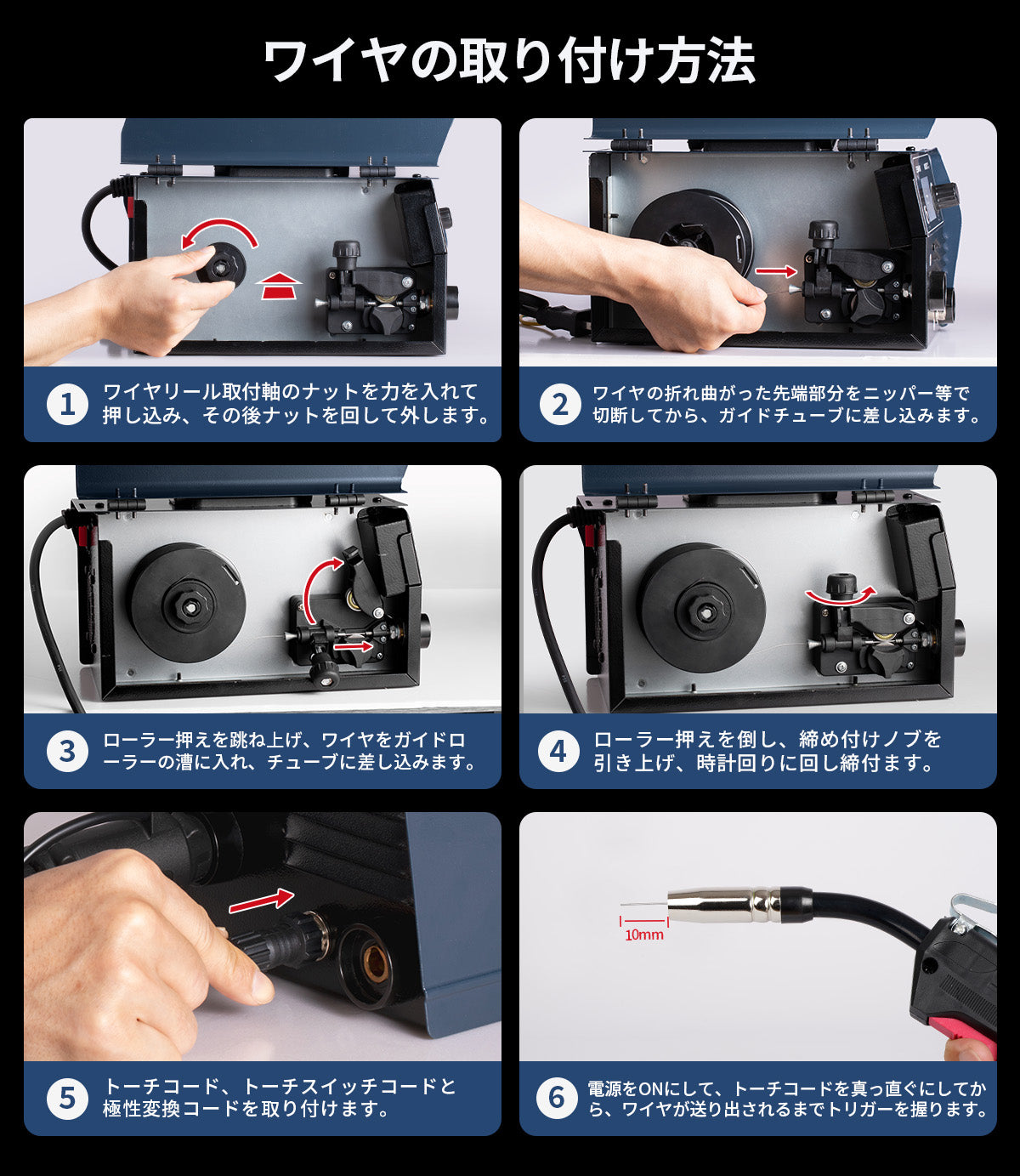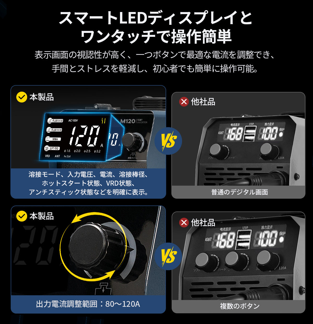 電流値・異常表示が見やすいLED液晶を採用。日本語クイックガイド同梱で、到着後すぐに基本操作を習得可能。