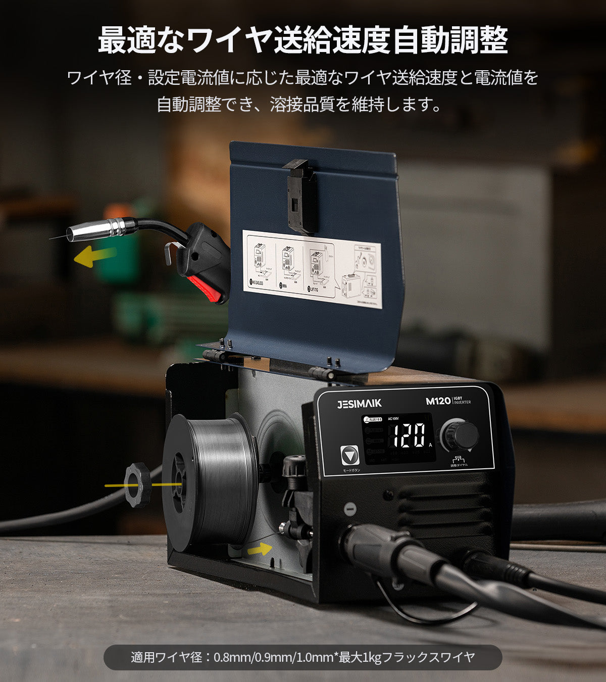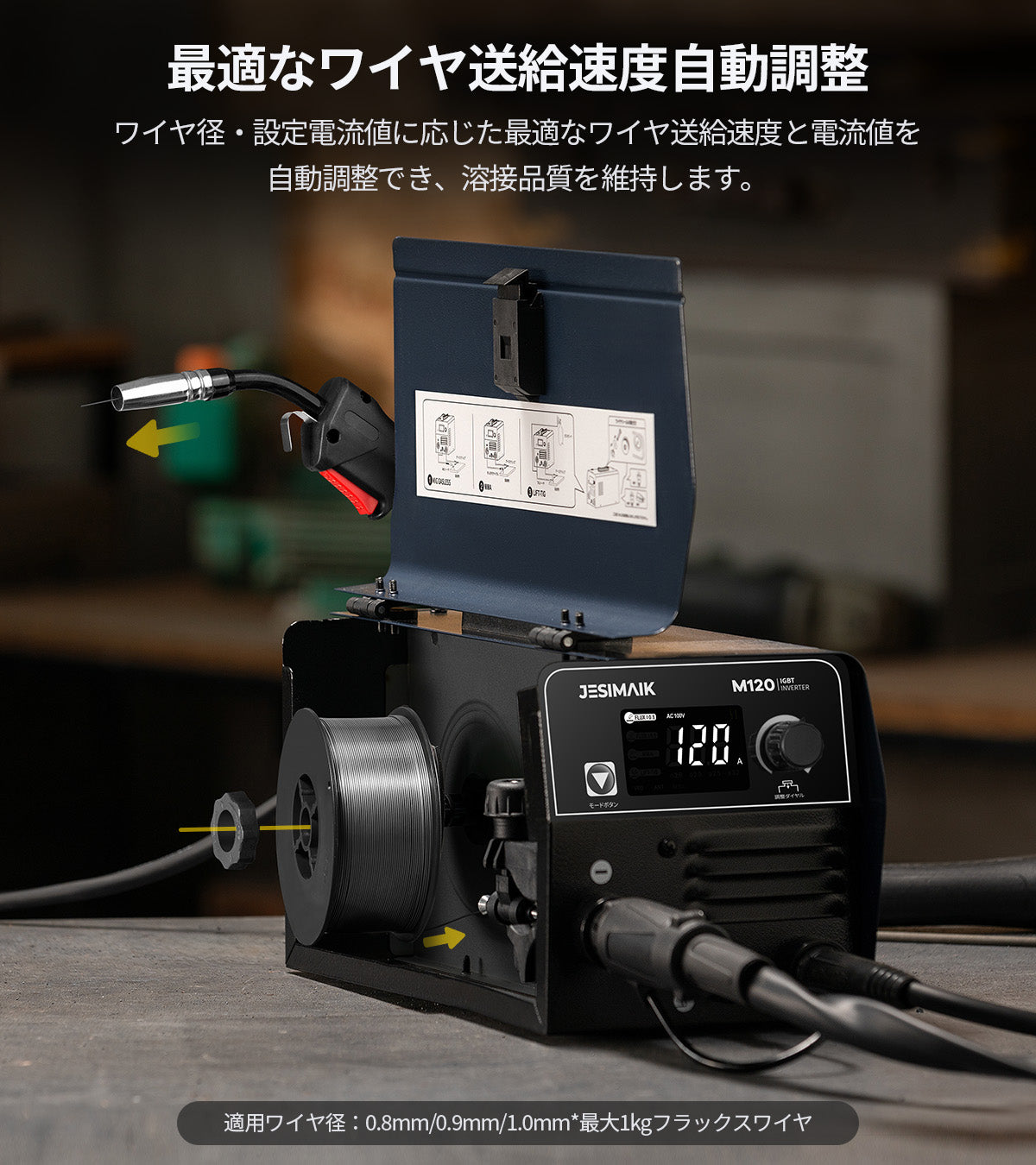 ノンガスMIG/MMA/LIFT TIGに1台で対応。ワイヤ径や板厚の選択に合わせて電圧を自動設定、ダイヤルで電流を微調整でき、再現性の高い条件出しをサポート。